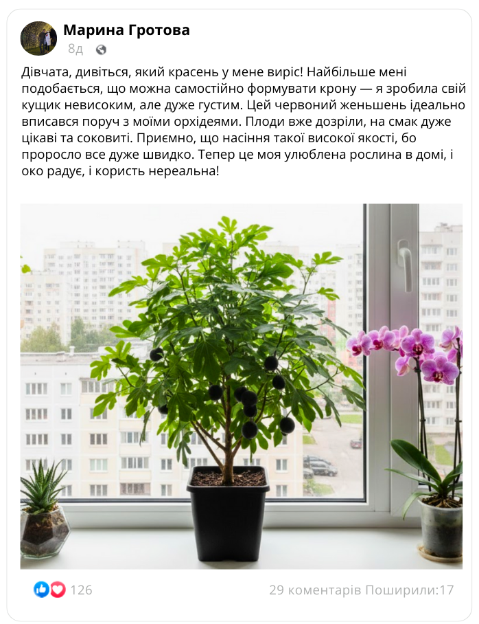 На відміну від звичайних сортів, цей женьшень дає солодкі та соковиті плоди, які є природним джерелом енергії та зміцнюють імунітет.