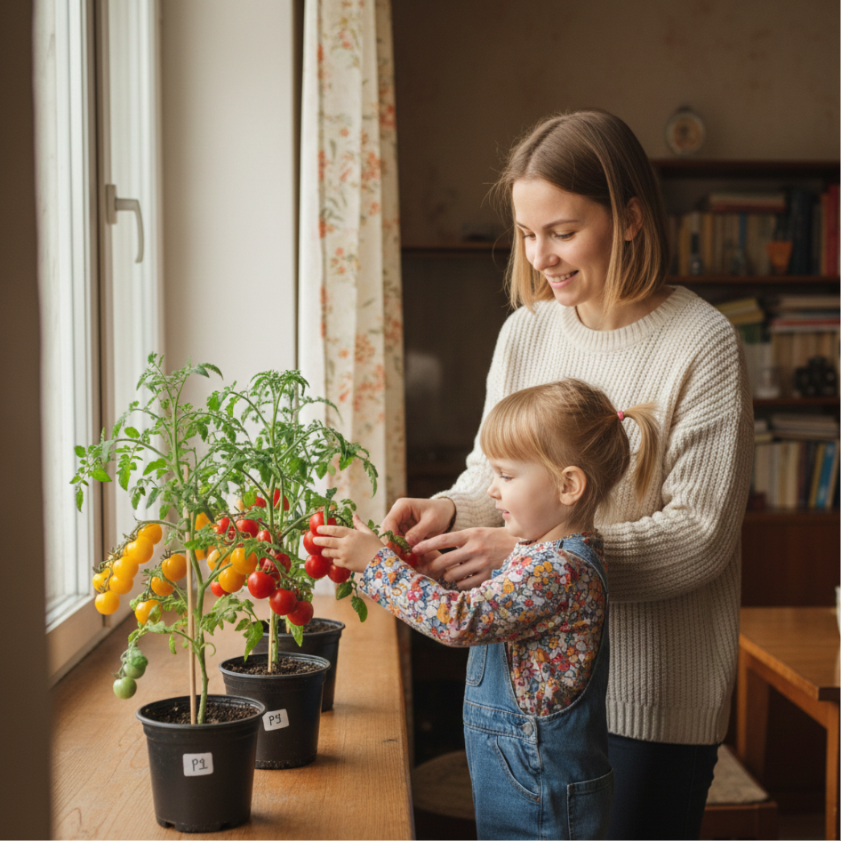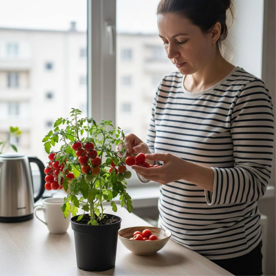 Оптимальний об’єм горщика та дренажна система забезпечують правильне зволоження та живлення без ризику переливу чи гнилі. Такі умови дозволяють F1 сортам формувати компактний, міцний кущ і давати ранні хвилі плодоношення — перші черрі можна побачити вже з 25-го дня.
